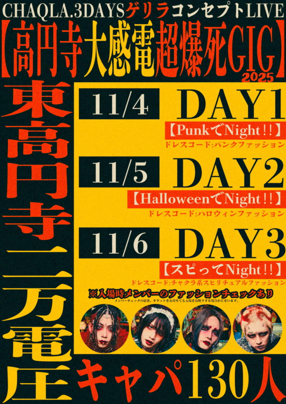 【電撃決定!】CHAQLA.3DAYSゲリラコンセプトLIVE【高円寺大感電超爆死GIG】開催決定!